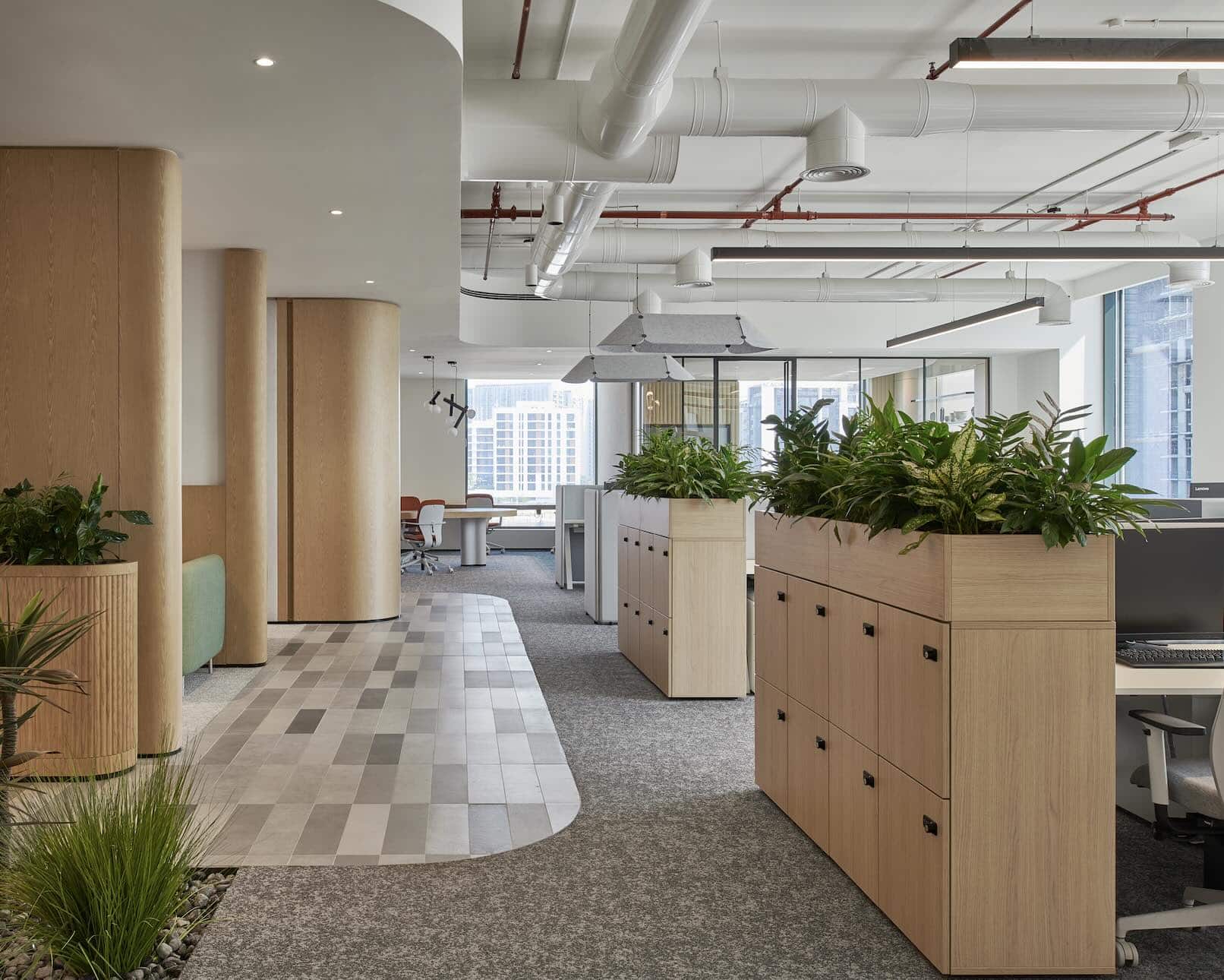 Soft furnishings in earthy tones complement the natural elements throughout, reinforcing the calming atmosphere of the environment. The presence of biophilic design elements is evident throughout the workspace, including indoor plants and bespoke planters, which add texture and life to the setting.