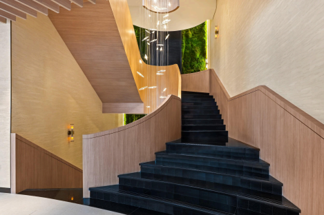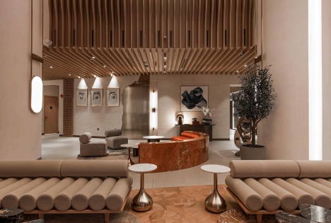 The refurbished lobby now shifts effortlessly throughout the day , from a natural light-filled morning lounge to a warmer, livelier, community-driven atmosphere in the evening. This transition is supported by subtle mood-changing lighting that responds to different times of day.
