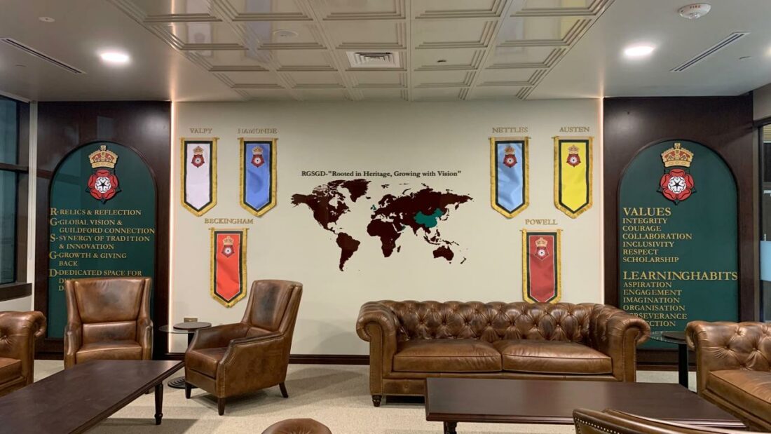 The Drawing Room offers a warm welcoming environment for parents and guests. A rich space where first impressions truly matter. With deep Chesterfield sofas, green cabinetry, and displays of blazers, ties, and trophies from the UK school, it blends comfort with history. A large wall map showcases RGS’s international campuses, while a replica of Guildford’s iconic town clock provides a thoughtful link to the home campus.